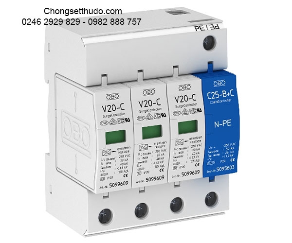 Chống Sét Lan Truyền 3P+N+E Dùng cho tải 3 pha Imax (8/20) 40kA/P, Imax (8/20) 110kA L-N, Imax (8/20) 50kA N-PE Type: V20-3+NPE-280.