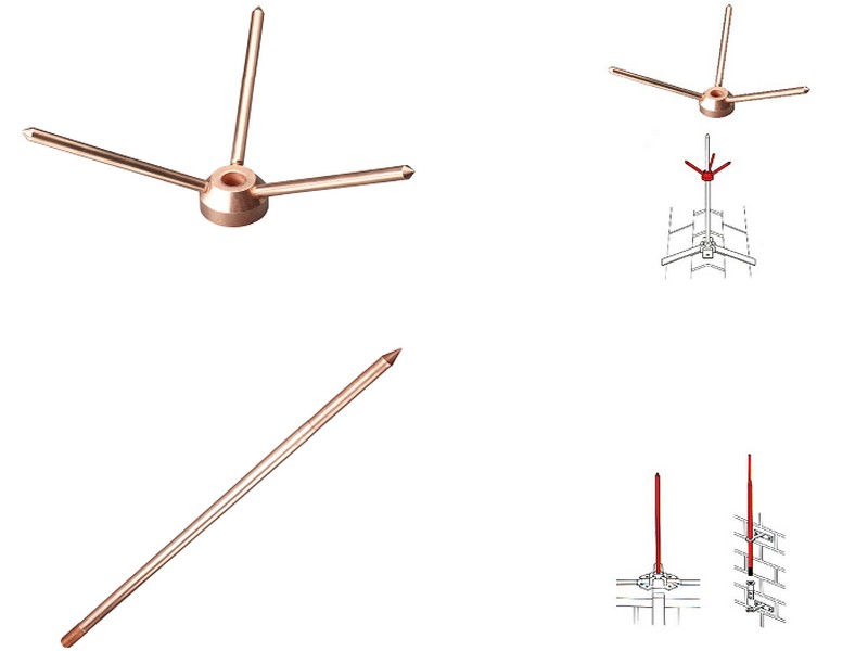- Các đầu kim thu xét: Thường làm từ thép mạ đồng, đồng thay đúc hoặc inox. Chiều dài của kim phụ thuộc nhiều vào cấu trúc của các công trình cần được bảo vệ