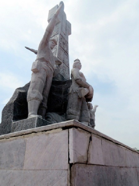 Với công trình 25 tỷ đồng được huy động bằng nguồn tiền ngân sách và tiền xã hội hóa. Dù mới hoàn thành tháng 7/2014, nhưng phần đế tam cấp của tượng đã bị lún sụt. Ảnh: Giang Chinh