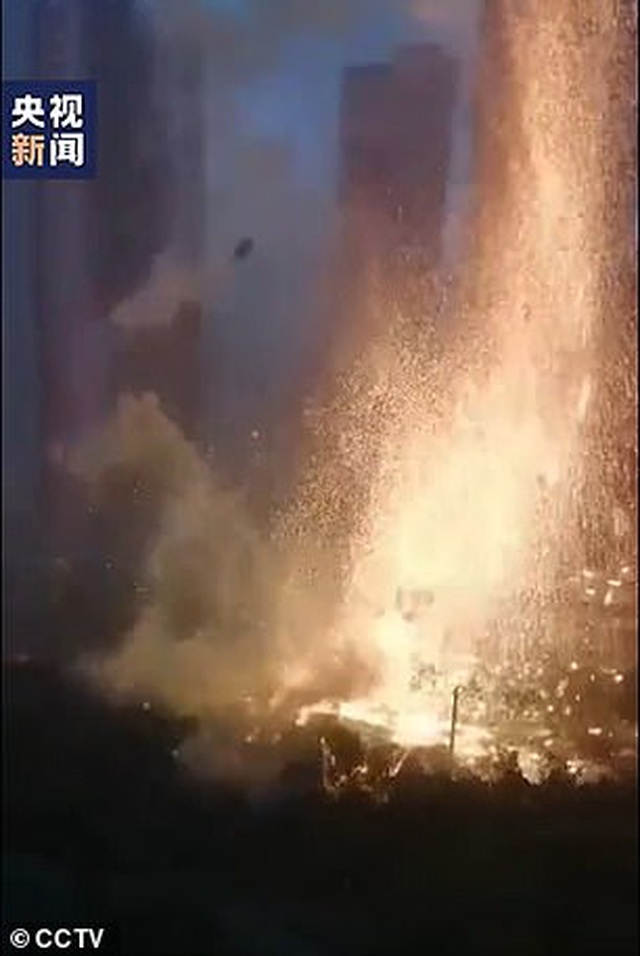 Cảnh quay do những người đi đường ghi lại cho thấy, sau một tiếng nổ lớn làm rung chuyển thành phố, ngọn lửa lớn bùng phát như cột lửa khổng lồ.